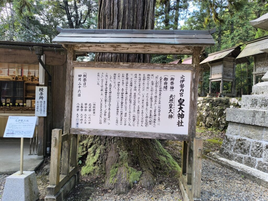 元伊勢内宮皇大神社は神社のホームページによれば、育み守護する産土神としてよりも、より根源的な皇祖天照皇大神という万(よろず)の神の大元神によせる信仰であって、皇大神が伊勢の聖地に遷られる以前に、四年間この地に鎮座された伊勢の元宮(もとみや)であるとの誇り高いものでありました。元伊勢の創建は、今元伊勢は古くから当地方の象徴的な存在として崇められてきた古社です。それは郷土をを去る二千六十年の遥かな昔であったと社伝は云いますが、多くの参拝者は鬱蒼たる天然の深い森に囲まれた簡素な社殿の佇まいに悠久の歴史の重みを感じ、神域に漂う霊気に触れ、神と人と自然が融け合う神仙境が現出していると感得されるのでしょうか、「身も心も洗われたような清々しさを感じる」とか「いのちの充実を感じる」とか様々な感動を伝えて下さる。この感動、感得こそが元伊勢信仰の原点ではないでしょうか。 伝承によれば、第10代崇神天皇39年(西暦紀元前59年)に、「別に大宮地を求めて鎮め祭れ」との皇大神の御教えに従い、永遠にお祀りする聖地を求め、それまでお祀りされていた倭笠縫邑(現奈良県桜井市三輪)をお出になったといわれます。まず最初に但波(丹波)へお遷りなり、そのご由緒により当社が創建されたと伝えられています。皇大神は、当地に4年お祀りの後、さらに諸所を経て、垂仁天皇26年(西暦紀元前4年)に、伊勢の五十鈴川上の聖地(今の伊勢神宮)にお鎮まりになりました。こうしたことから当社は伊勢神宮内宮の元の宮として、「元伊勢内宮」あるいは「元伊勢皇大神宮」「大神宮さん」などと呼ばれ、今も庶民の篤い信仰が続いています。